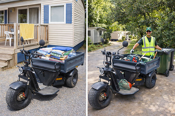 Le triporteur électrique Rhino répond précisément à ces usages. Conçu pour les professionnels, il permet de faciliter l’organisation interne du camping tout en améliorant le confort de travail des équipes. Compact, maniable et silencieux, il s’intègre facilement dans les allées et les espaces de circulation, sans gêner les vacanciers ni dénaturer l’environnement.
